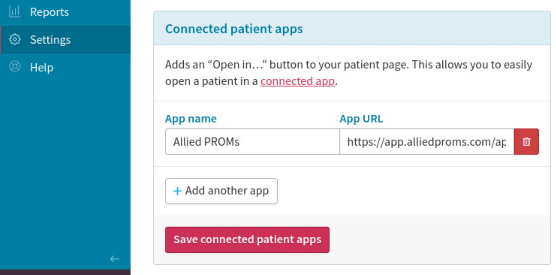 Add a new app, name "Allied PROMs", with the URL "https://app.alliedproms.com/app/patients"